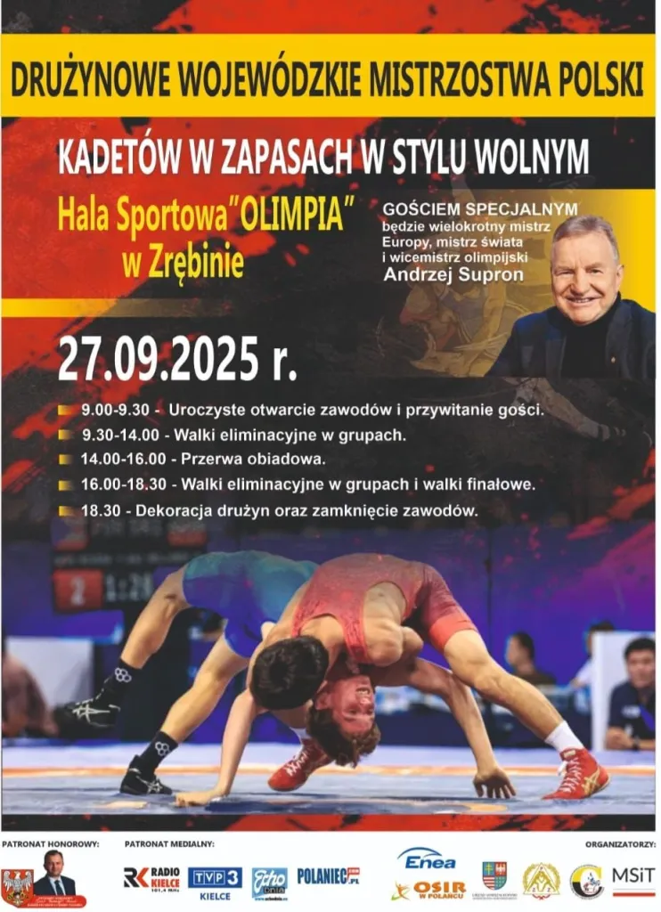 W dniu 27 września 2025 na Hali Sportowej „Olimpia” w Zrębinie rozegrany zostanie drużynowy turniej zapaśniczy kadetów w stylu wolnym pod patronatem honorowym Burmistrza MIasta i Gminy Połaniec - Jacka Nowaka.