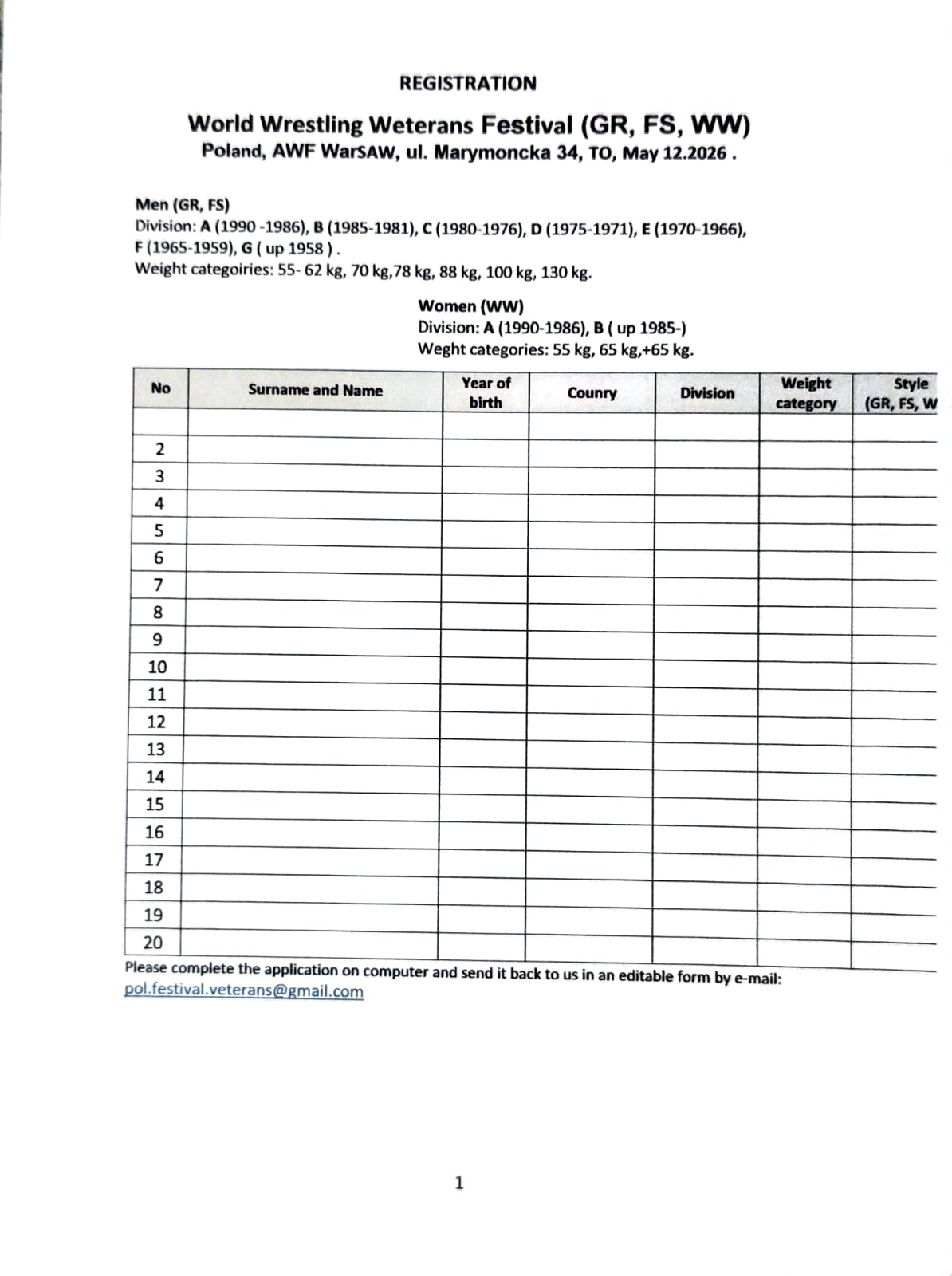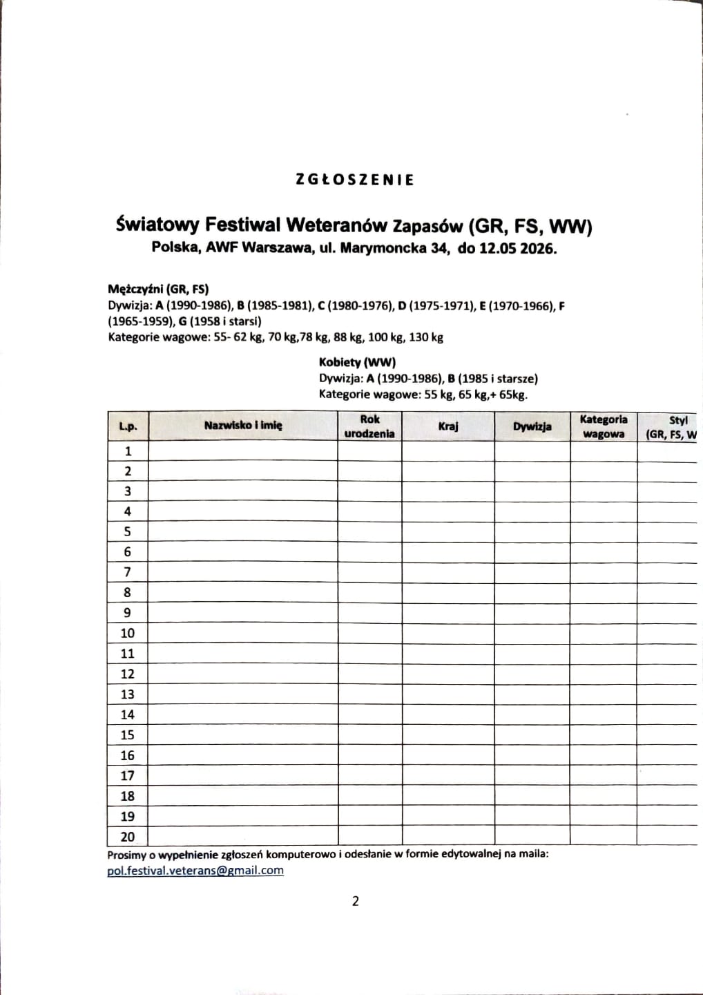 Zgłoszenia: Należy przesyłać drogą elektroniczną na załączonym druku (w formie edytowalnej) na adres: pol.festival.veterans@gmail.com.