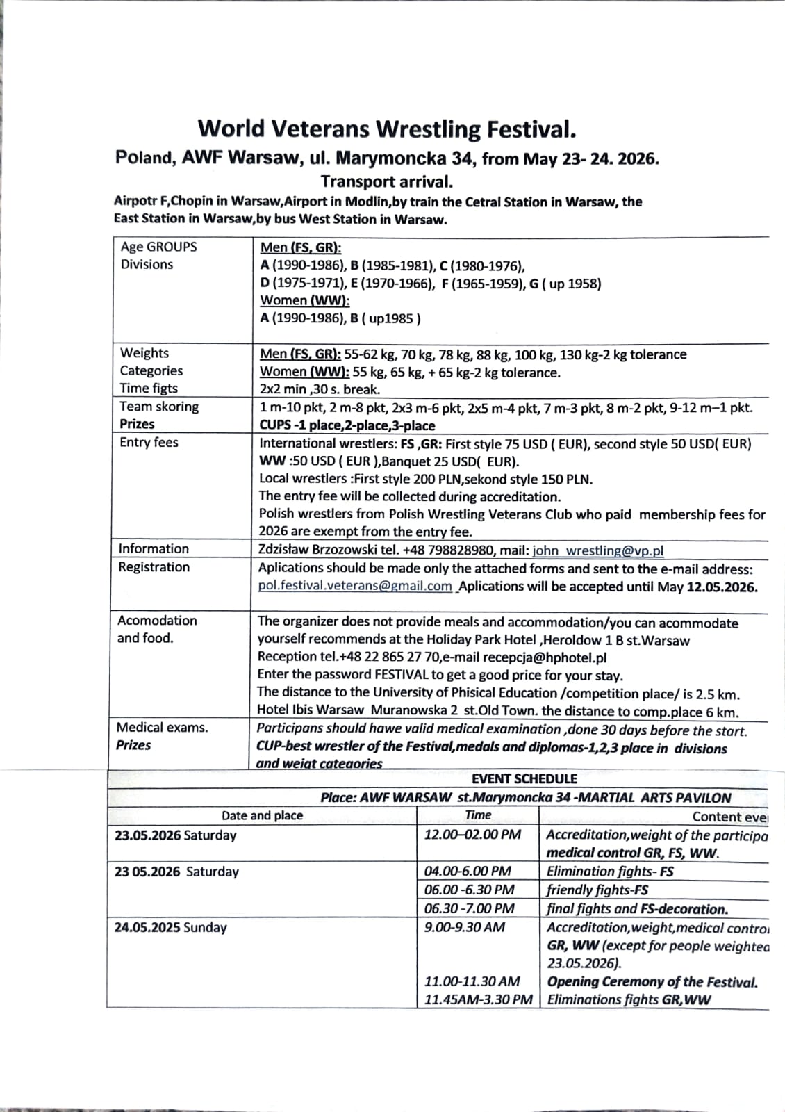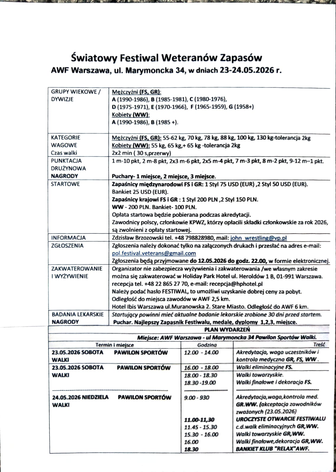 Polski Związek Zapaśniczy oraz organizatorzy serdecznie zapraszają na Światowy Festiwal Weteranów Zapasów, który odbędzie się w dniach 23- 24 maja 2026 roku w obiektach AWF Warszawa.