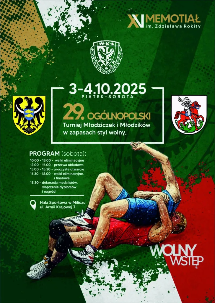 W dniu od 4 października 2025 r. na hali sportowej w Miliczu na ul.Armii Krajowej 7 rozegrane zostaną zawody młodziczek i młodzików w zapasach kobiet i w stylu wolnym.